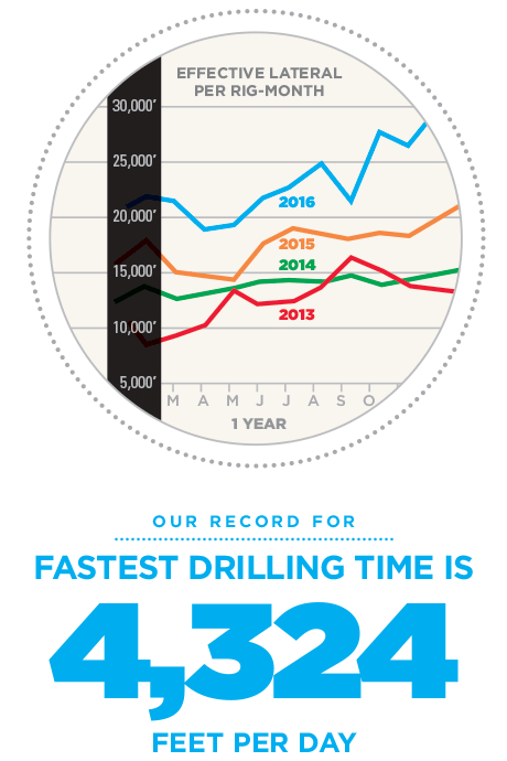 Another way we seek to increase efficiencies is through drilling longer lateral wells. Since we began horizontal development of resource plays in 2004, we have observed a strong correlation between the lateral length in a well and the amount of hydrocarbons it will recover. As a result, we seek to drill long laterals wherever possible. This allows us to spread the fixed cost of the vertical wellbore across more reserves and production, lowering the unit cost and enhancing the economics. Longer laterals have the additional benefit of requiring fewer wells to develop a property, minimizing surface impacts and saving facility costs. Our land team works diligently to bolt-on acreage to our existing position or execute acreage swaps with nearby operators in order to further expand the average lateral length of our drilling inventory.