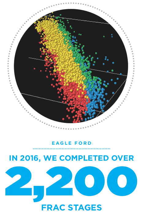 Drilling a well is only half the battle (or closer to a third when the capital split between drilling and completion is considered), so we also strive to complete our wells as efficiently as possible. In 2016, our dedicated Halliburton frac crew completed more than 1,900 frac stages in the Eagle Ford Shale. This was up from approximately 1,800 frac stages in 2015 and marked the fifth consecutive year that our crew has ranked as one of the most efficient crews in Halliburton’s fleet.